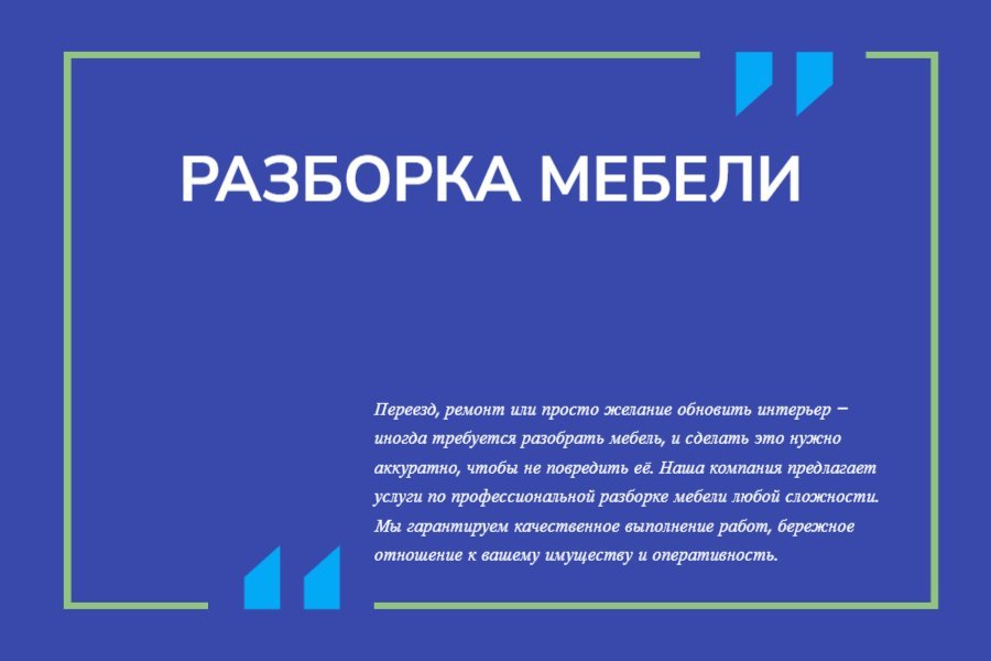 - Соблюдение сроков и аккуратность. Мы ценим ваше время и выполняем работы точно в оговоренные сроки. Наши мастера работают аккуратно, оставляя после себя чистоту и порядок. Вы можете быть уверены, что вся мебель будет разобрана и подготовлена к транспортировке в кратчайшие сроки.