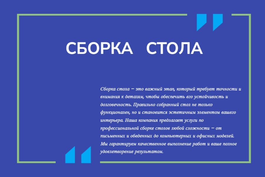 - Качество и точность. Мы используем только профессиональные инструменты и крепежные материалы, что гарантирует прочность и устойчивость собранного стола. Вам не придется беспокоиться о перекосах, шаткости или проблемах с креплениями – каждый элемент будет установлен с максимальной точностью.